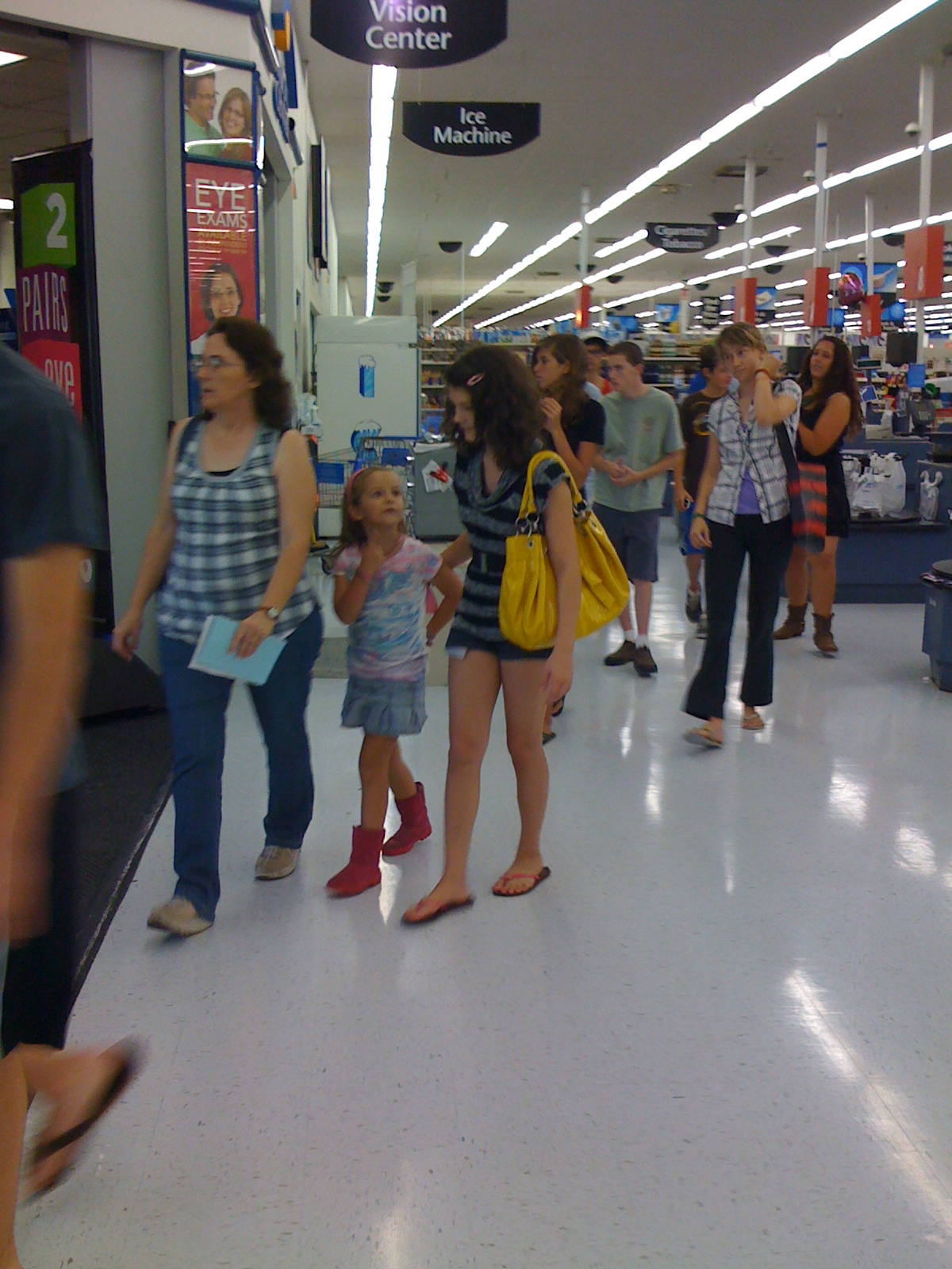 Now, the thing about a house church - one of the things I love most - is that we do ministry together. All kinds of ministry. We lay hands upon one another and pray, from the youngest kids right on up to our most, um, mature adults. We eat together. Worship together in song. Make decisions about spending, hold neighborhood festivals, swim, prayer walk the neighborhood -- everything! To be sure, there are special breakout times for the teens and children, too but a lot of what we do we do as a family. And so it was that, a couple weeks ago, we broke up into groups of kids and adults and began to clean out the Walmart.